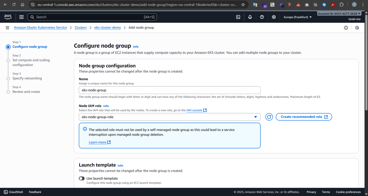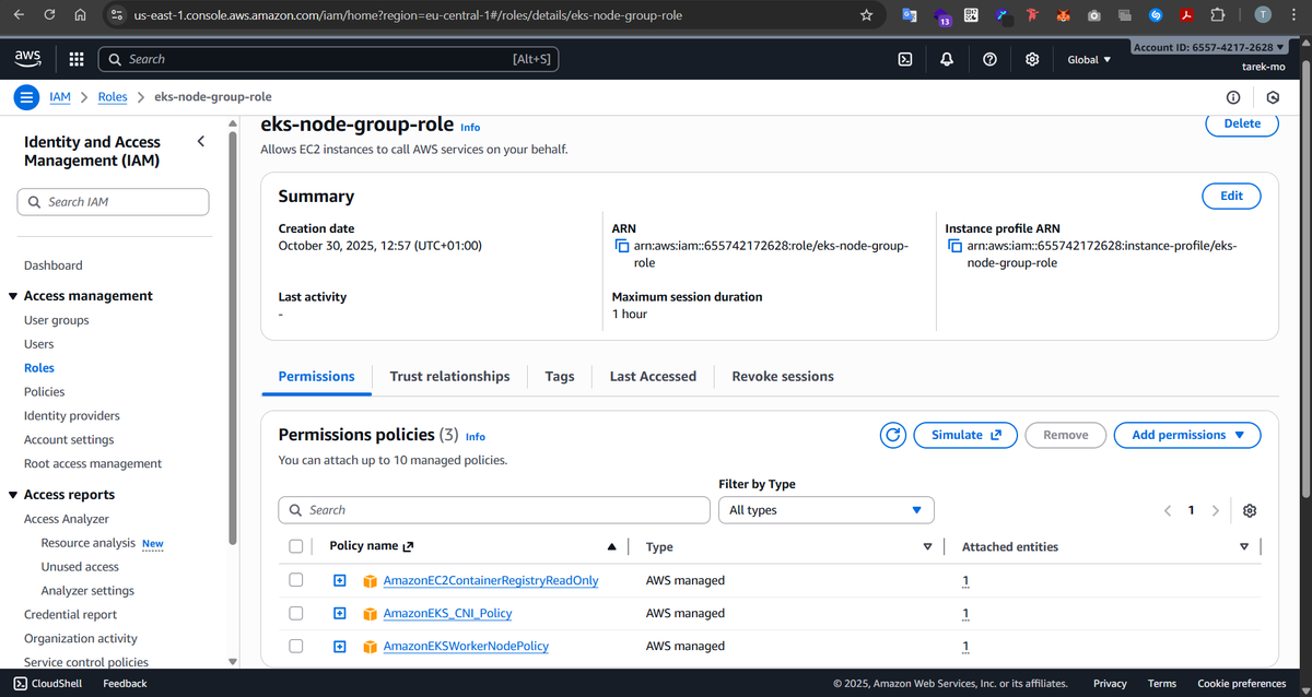 Worker nodes need their own permissions to do Kubernetes things, like pulling container images from ECR, attaching network interfaces, or communicating with the cluster. We create a role called eks-node-group-role and attach the following AWS-managed policies: