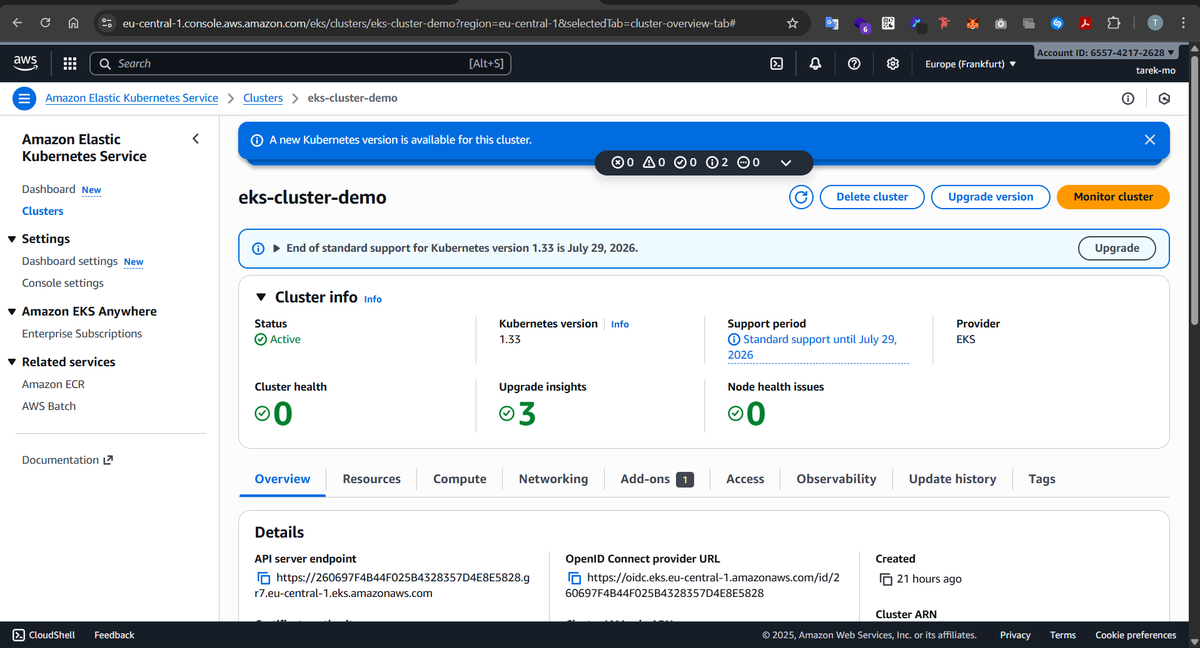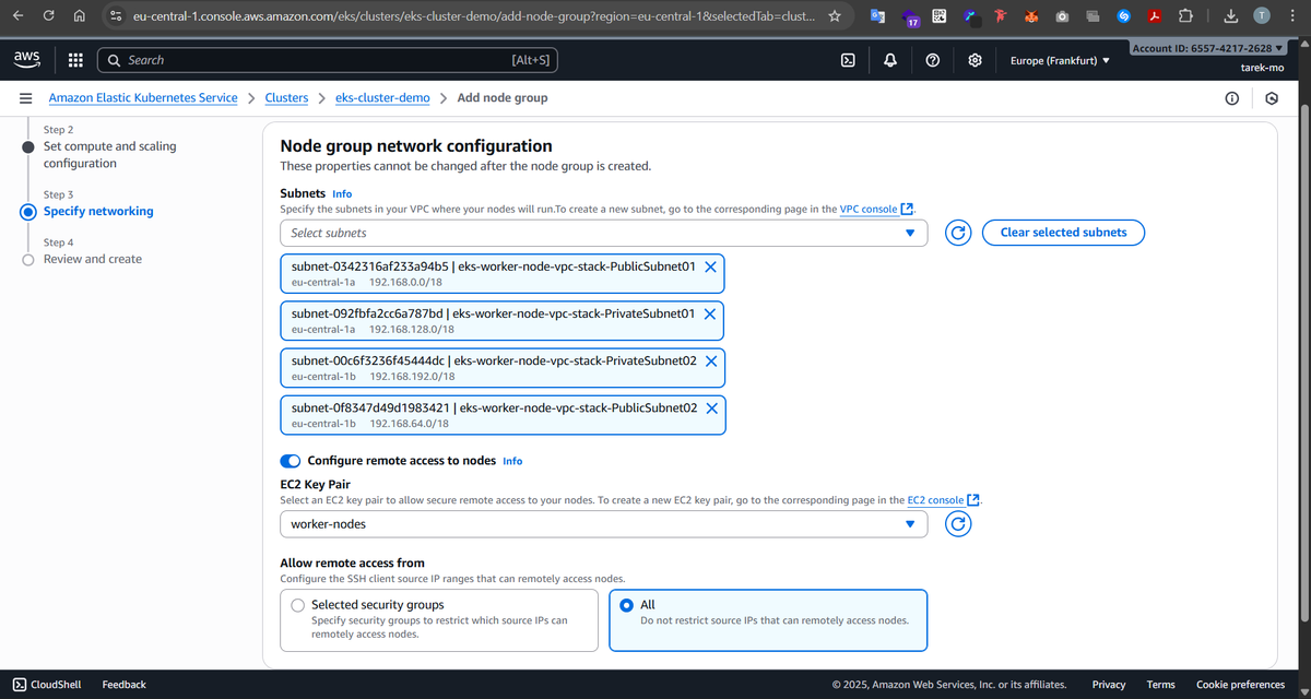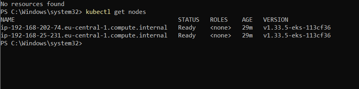 Each node will automatically join the cluster using the IAM role we just created. The private subnets give them a safe home to run pods, while the public subnets allow AWS to assign public IPs if needed (for example, for troubleshooting or SSH via a bastion host). With this setup, our cluster is now fully operational, and we can start deploying workloads!