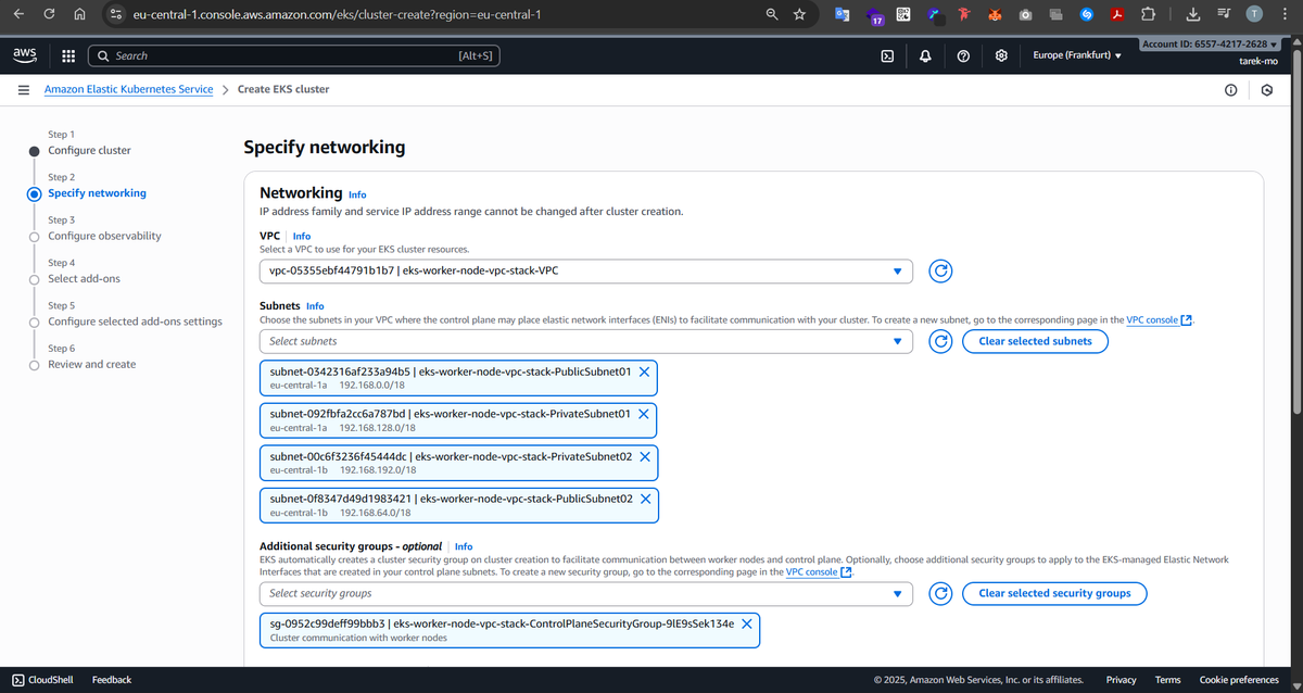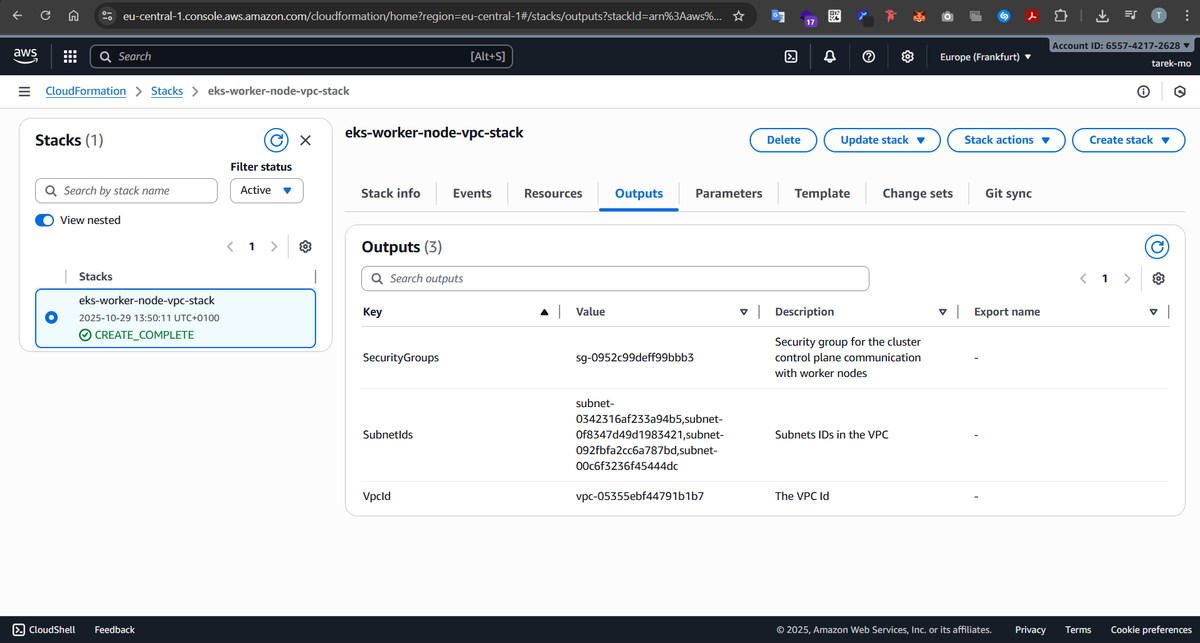 With IAM and VPC in place, it’s time to bring up the EKS cluster. The cluster control plane is fully managed by AWS — it runs the API server, etcd, and other controllers behind the scenes. Our VPC and subnets are where the worker nodes will live and communicate with the control plane securely. By attaching the cluster to the subnets we created, we make sure the control plane can talk to the nodes and the nodes can talk to each other.