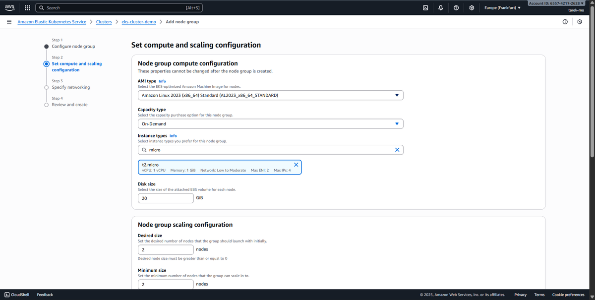 Now it’s time to bring our worker nodes online. We create a node group with 2 EC2 instances (t2.micro), and we attach it to the cluster we created earlier. We select the same four subnets from the VPC — two public and two private.