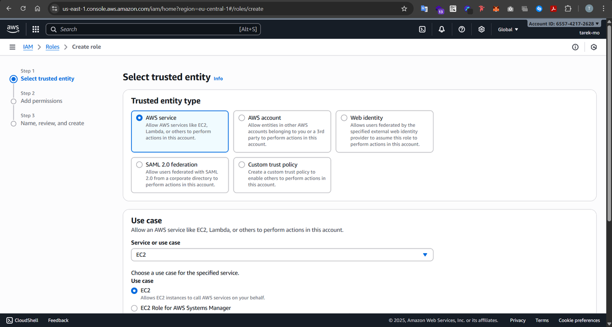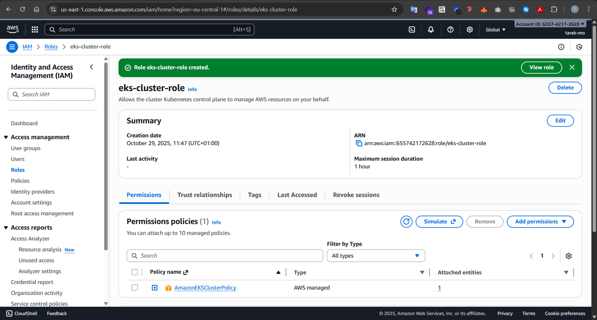 Before we can spin up our EKS cluster, we need to give EKS a role it can assume to manage resources on our behalf. So we create an IAM role called eks-cluster-role and attach the AmazonEKSClusterPolicy to it. This gives the control plane the permissions it needs to create networking, manage cluster state, and talk to other AWS services. Without this role, the cluster simply won’t be able to function.