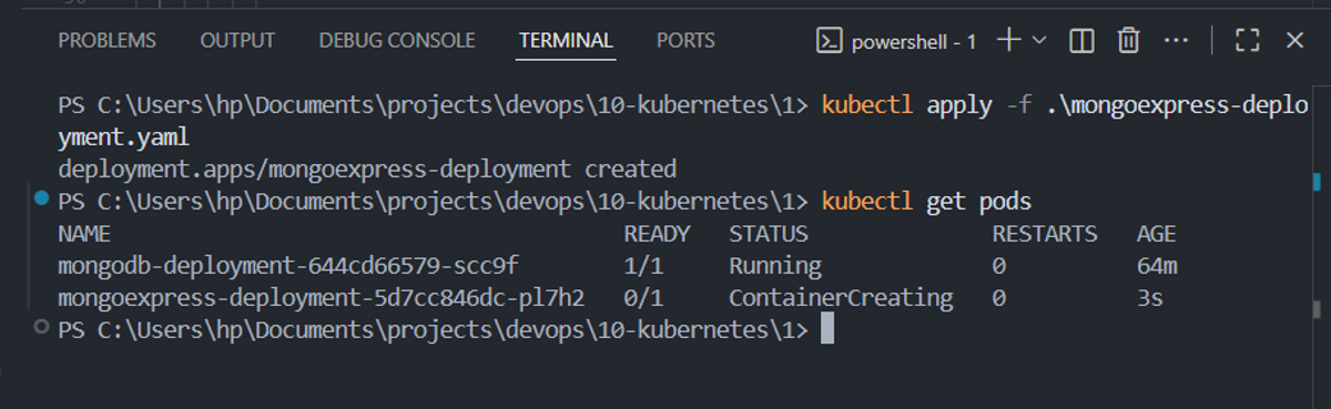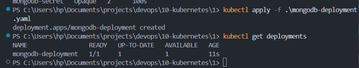 We need to create a mongodb deployment which will also create the underlying ReplicaSet and pods in order for mongodb container to be able to run and communicate internally with our mongo-express deployment later