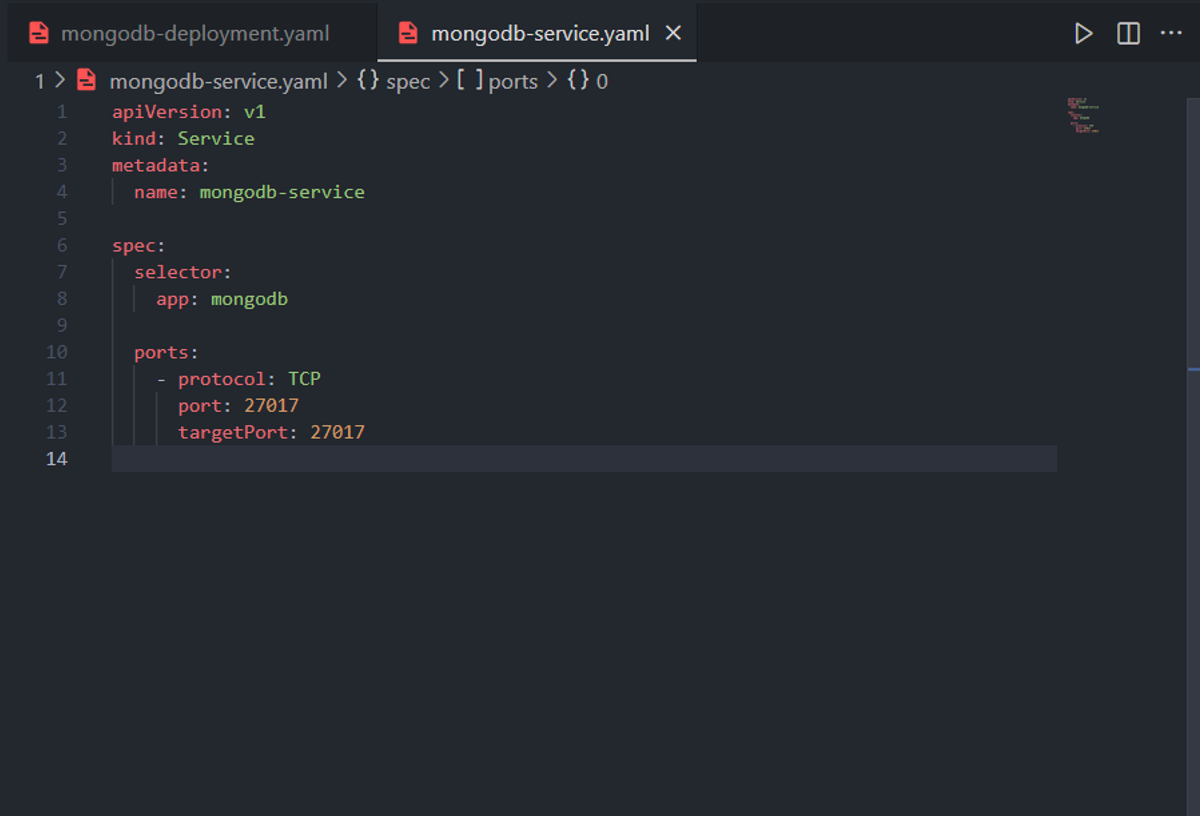 And for that we create a mongodb-service.yaml file with the following attributes:
