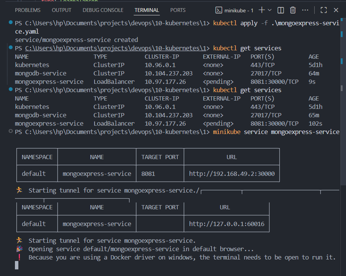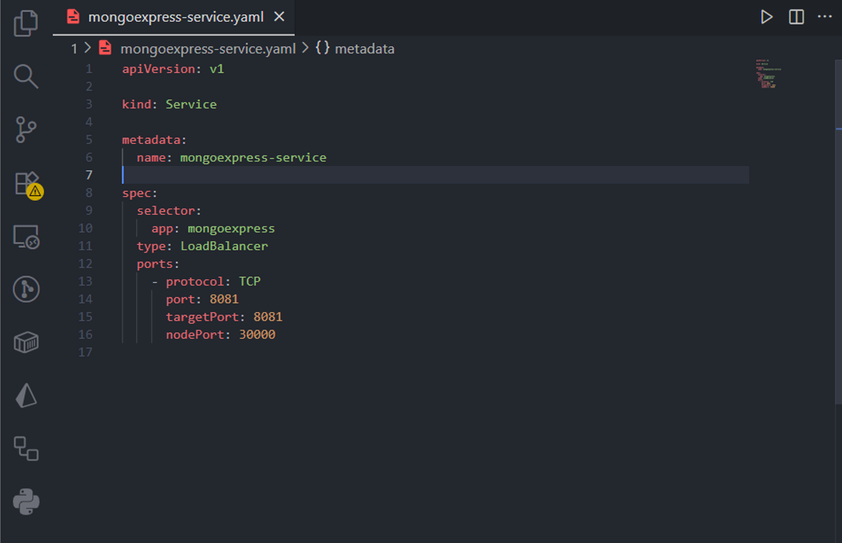 This mongoexpress-service.yaml file will expose our mongoexpress-service pods to be able to be accessed from outside the cluster through our web browser. We used the following attributes to make that happen: