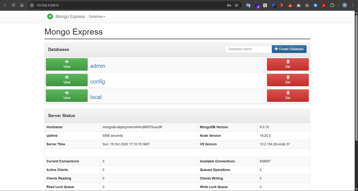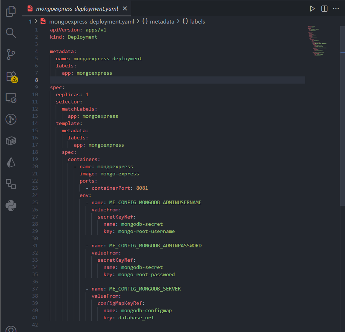 We use similar patterns to what we used when creating the mongodb-deployment file plus adding the ME_CONFIG_MONGODB_SERVER container variable needed for Mongodb Express to access our mongodb database
