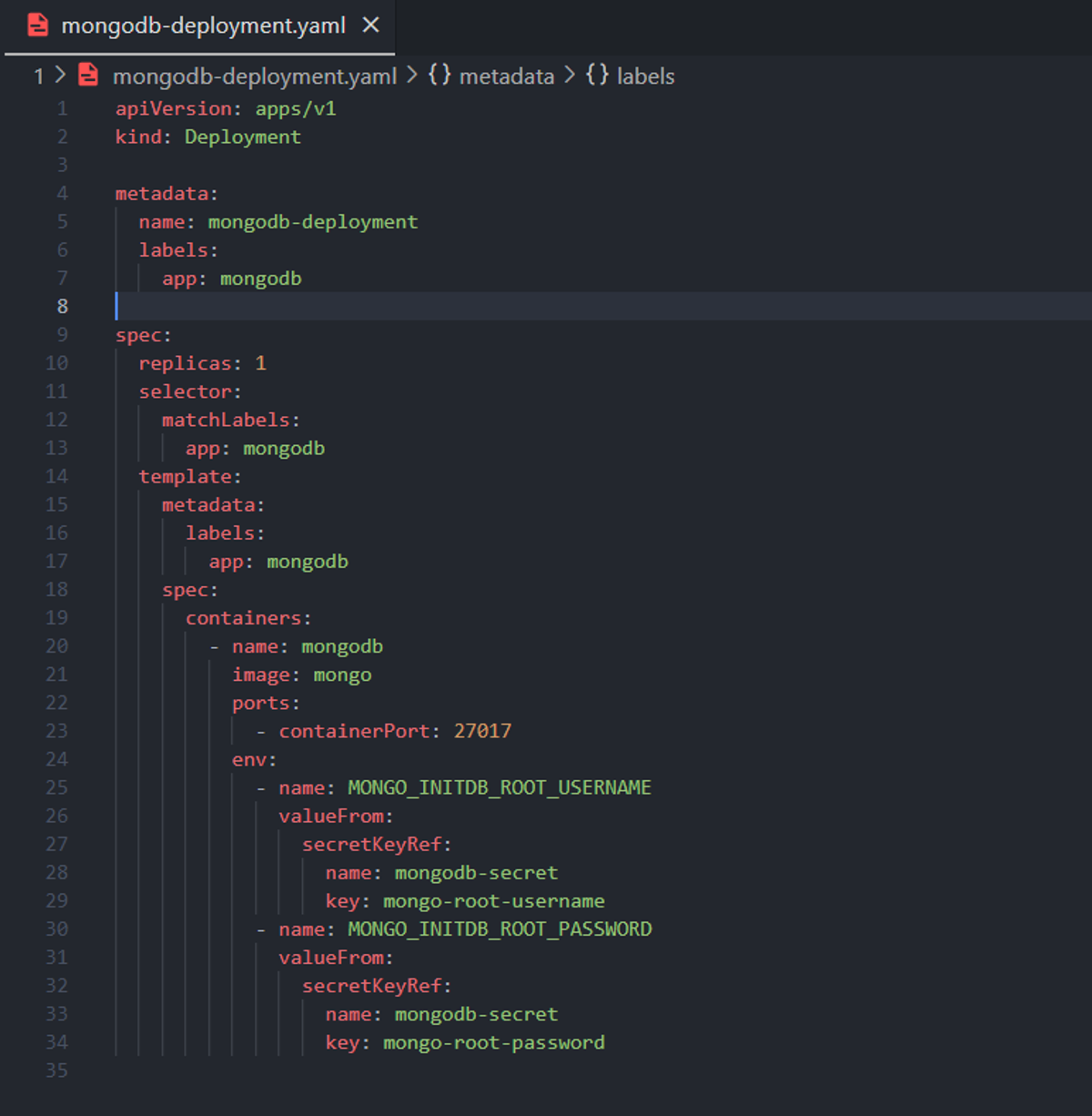 Now we create the mongodb-deployment.yaml file which contains the blueprint for our mongodb deployment, we use the following params: