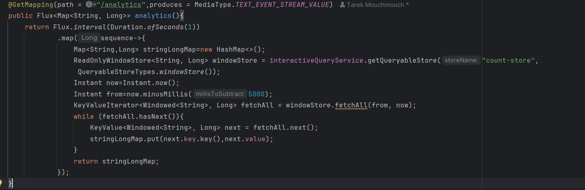 - It uses InteractiveQueryService to query the windowed counts stored by Kafka Streams.