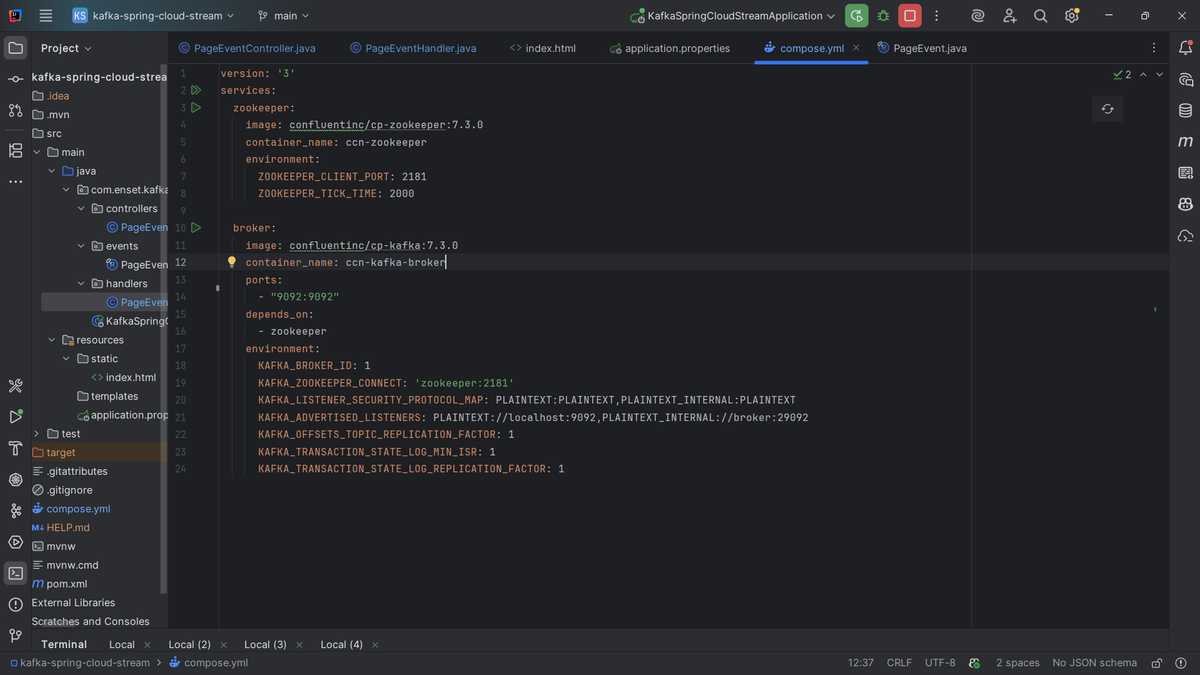 Environment variables configure ports, broker ID, listener addresses, and replication factors. With this, I can run the whole system locally without installing Kafka manually.