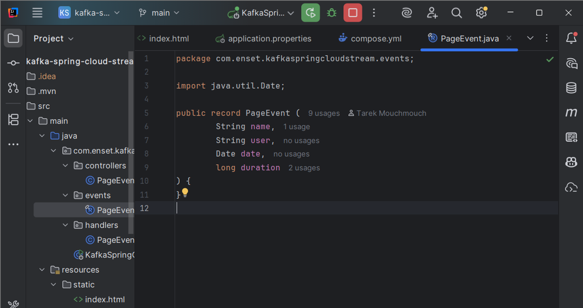Records automatically provide getters, toString(), and equals/hashCode, keeping the code clean. Each PageEvent can be serialized and sent through Kafka easily.