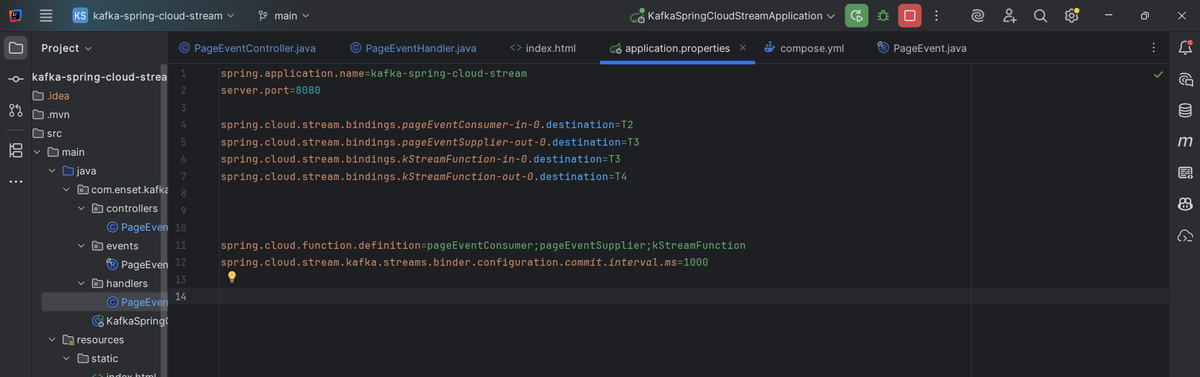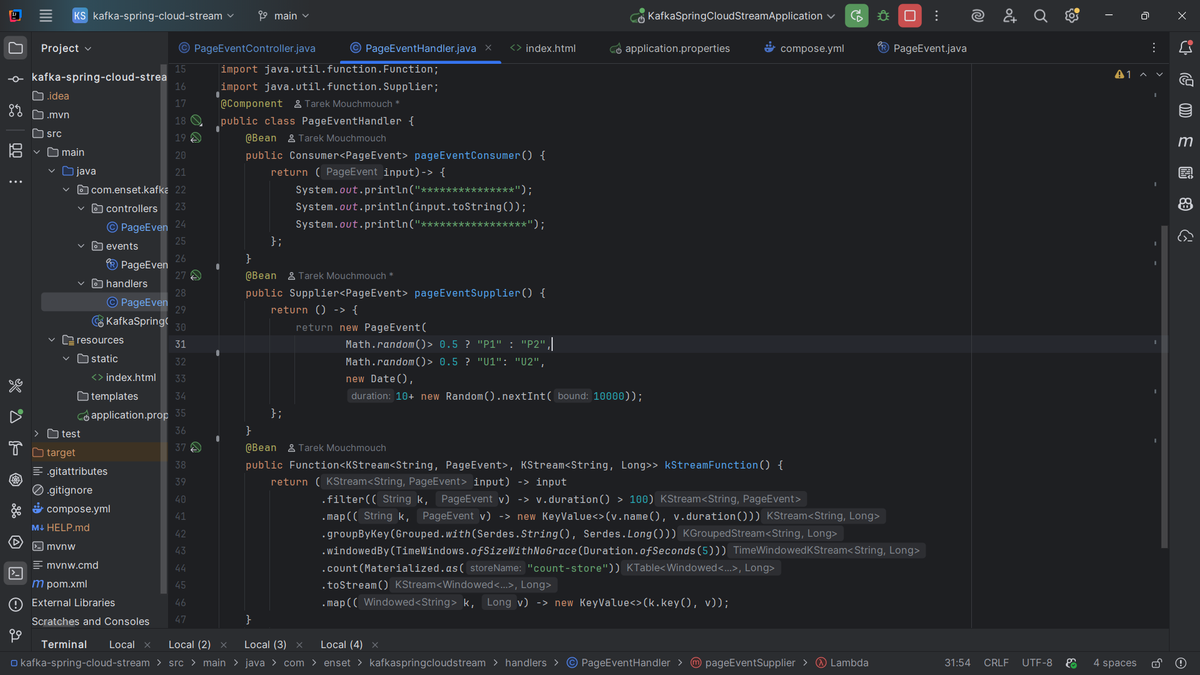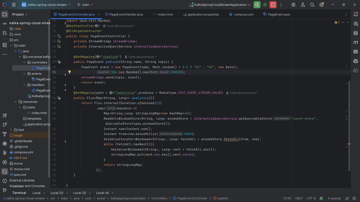- The /publish endpoint generates a random PageEvent and sends it to a Kafka topic using StreamBridge.