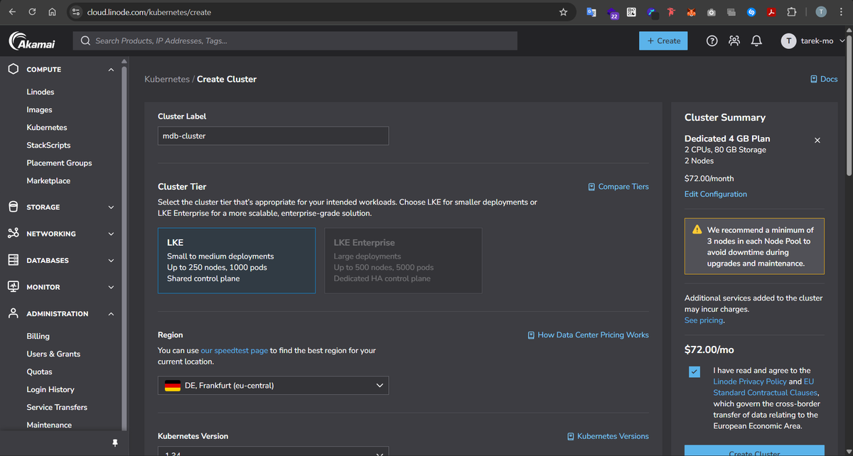 The first step was to create the Kubernetes cluster itself. Linode makes this really easy with LKE: