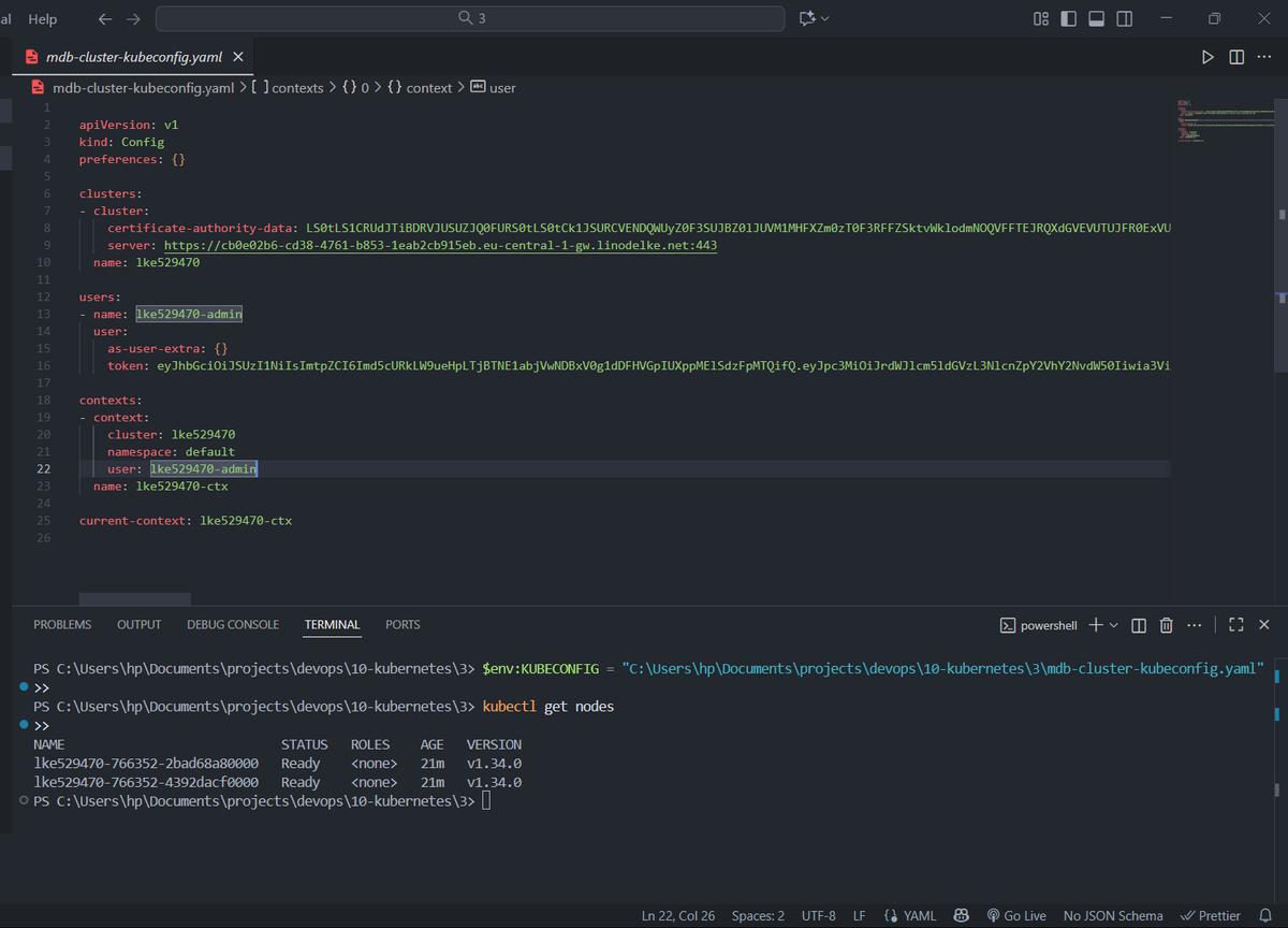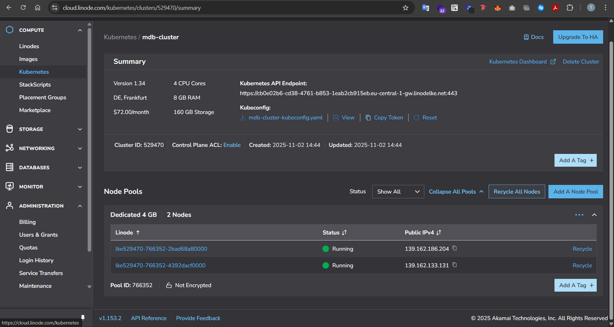 Once the cluster was ready, Linode gave me a mdb-cluster-kubeconfig.yaml file to connect locally.