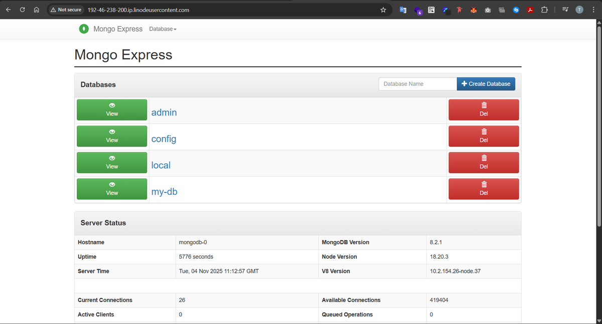 Now our mongo-express can be accessed through the web using the dns generated for the public ip address of our Linode load balancer: