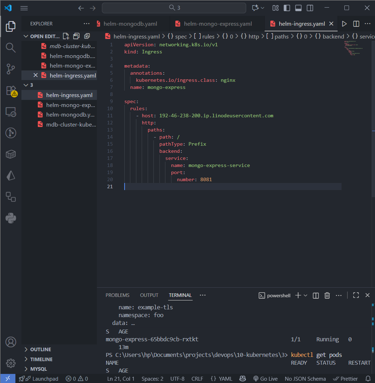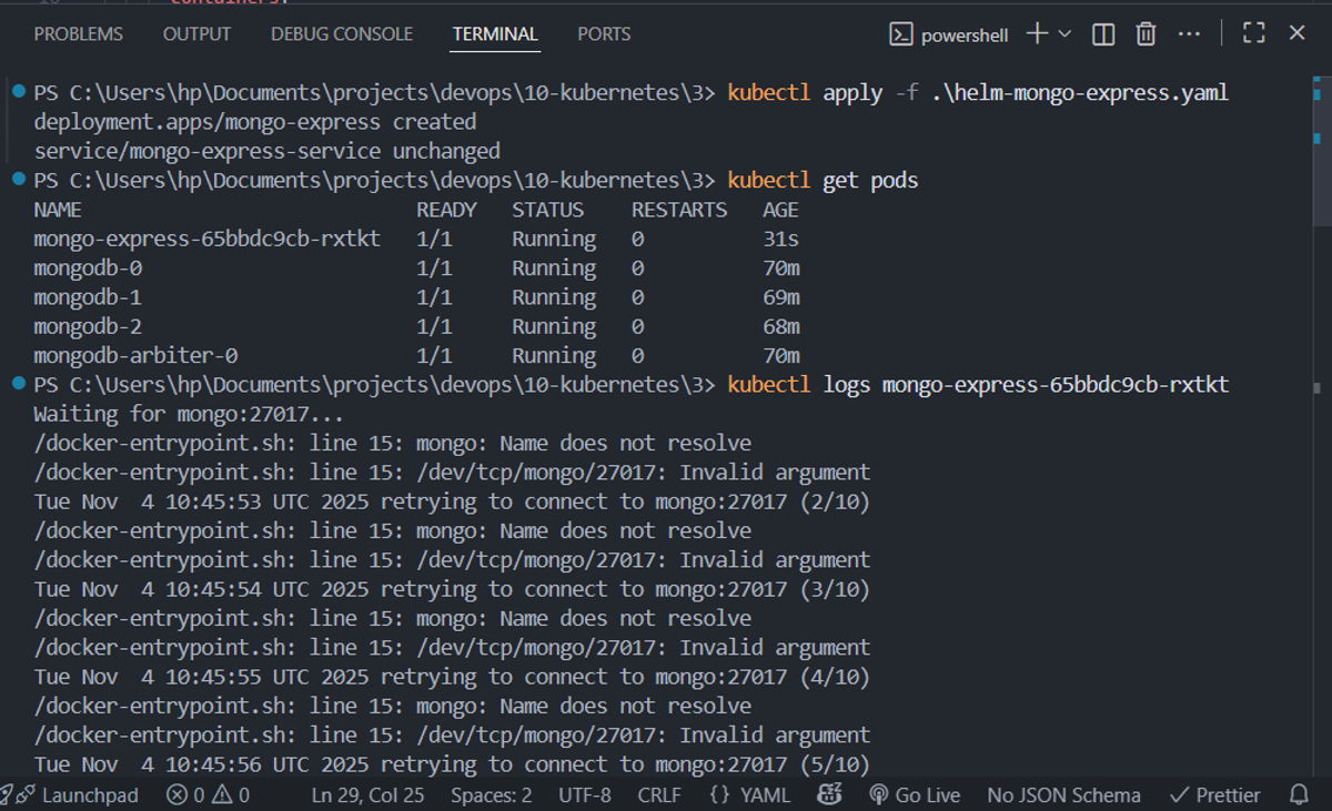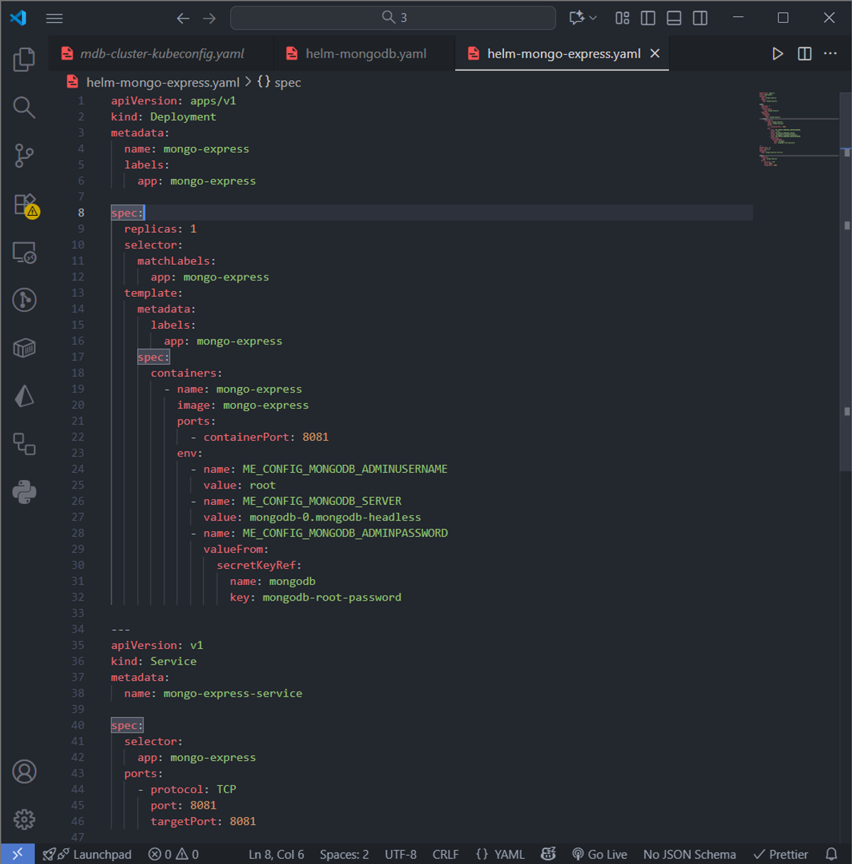 I created a Deployment with a single pod and a ClusterIP service (didn't use Helm charts here cuz I didn't feel the need to as this is just a simple 1 replica pod mongo-express):